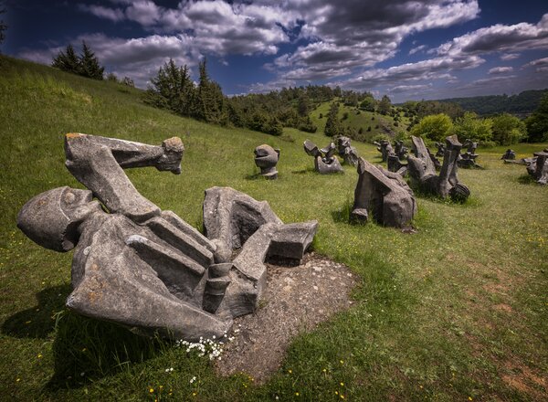 Das Figurenfeld: 78 überlebensgroße Plastiken kauern, bäumen sich auf und kriechen auf dem Figurenfeld des Künstlers - ein eigentümlicher Gegensatz zu der kargen Juralandschaft des Hessentals. Einzelne Figuren weisen zunächst den Weg in die...