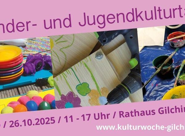 Sonntag, 26.10.2025 11:00-17:00 Uhr Kinder- und Jugendkulturtag Rathaus Gilching Tolle Angebote zum Ausprobieren, Staunen, Entdecken und Mitmachen für Groß und Klein Weitere Infos ab 18.9. hier