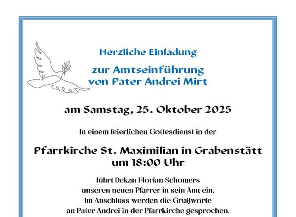 Herzliche Einladung zur Amtseinführung von Pater Andrei Mirt. In einem feierlichen Gottesdienst in der Pfarrkirche St. Maximilian in Grabenstätt führt Dekan Florian Schomers unseren neuen Pfarrer in sein Amt ein. Im Anschluss werden die Grußworte...